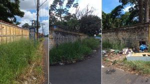 Local virou ponto de descarte de lixo e abrigo para usuários de drogas; mato alto...