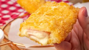 Quitute é feito com massa de pastel enrolada com muçarela e presunto e depois é...