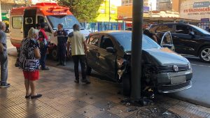 Idoso perde o controle da direção, acerta poste e quase atinge passageiros que aguardavam ônibus no Centro