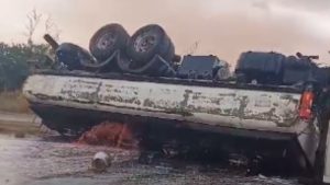 Caminhão carregado com diesel tomba na Anhanguera e combustível vaza na rodovia