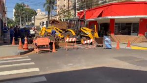 Quarteirão na rua Rui Barbosa, no Centro de Ribeirão Preto, é bloqueado para reparos em tubulações