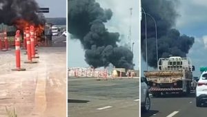 Caminhão de biodiesel pega fogo na rodovia Carlos Tonani