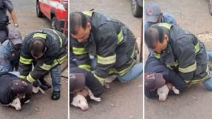 Vítima, de 35 anos, foi agredida pelos criminosos e mordida pelo cão; o crachá, bolsa...
