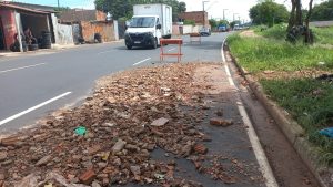 Redução de espaço, causada por pedras na via, é logo após a ponte da rua...