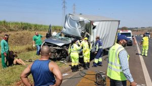 Vítima ficou presa nas ferragens e equipes dos Bombeiros precisaram ser acionadas; colisão foi foi...