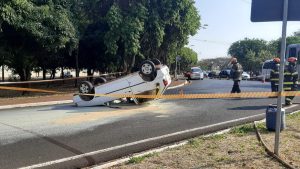 Motorista de 27 anos sofre ferimento na perna após capotar carro em acidente com ônibus na Treze de Maio