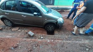Motorista fica com carro preso em trecho em obras na rua Florêncio de Abreu no Centro de Ribeirão